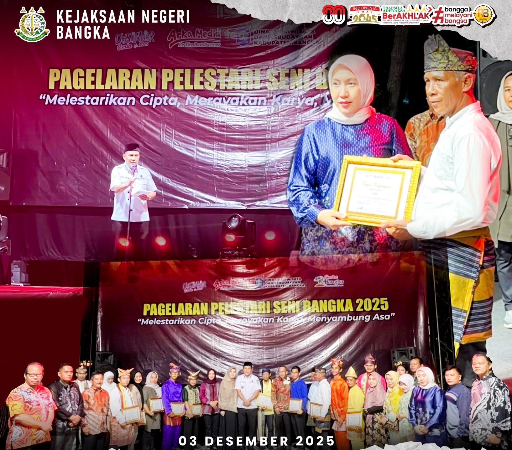 Mewakili Kepala Kejaksaan Negeri Bangka Kasi Datun Maharani Cahyanti, S.H., M.H. menghadiri Pagelaran Pelestari Seni Bangka 2025. Bertanjuk “Melestarikan Cipta, Marayakan Karya, Menyambung Asa” bertempat di Taman Sari Sungailiat yang di selenggarakan oleh Dinas Pariwisata dan Kebudayaan Kab. Bangka.
